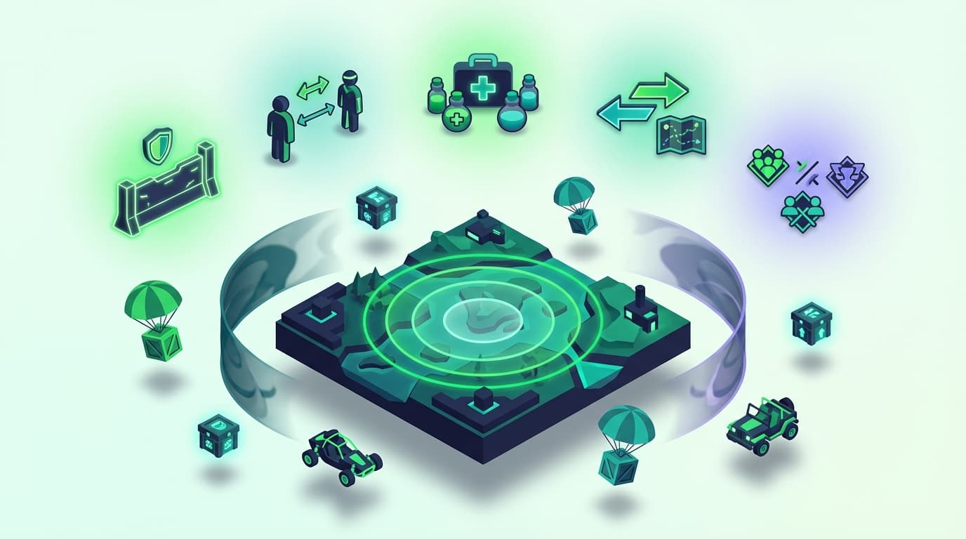 - 安置の位置: 次の安置がどこに来るかは基本的にランダム。自分たちの近くに安置が来れば移動の必要がなく有利だし、遠くに来れば危険な移動を強いられる